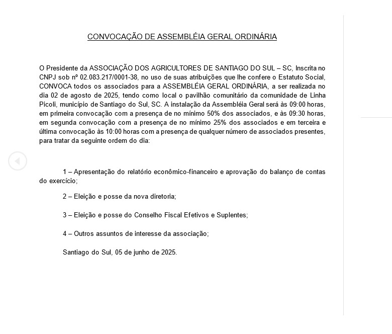 CONVOCAÇÃO DE ASSEMBLÉIA GERAL ORDINÁRIA ASSOCIAÇÃO DOS AGRICULTORES DE SANTIAGO DO SUL